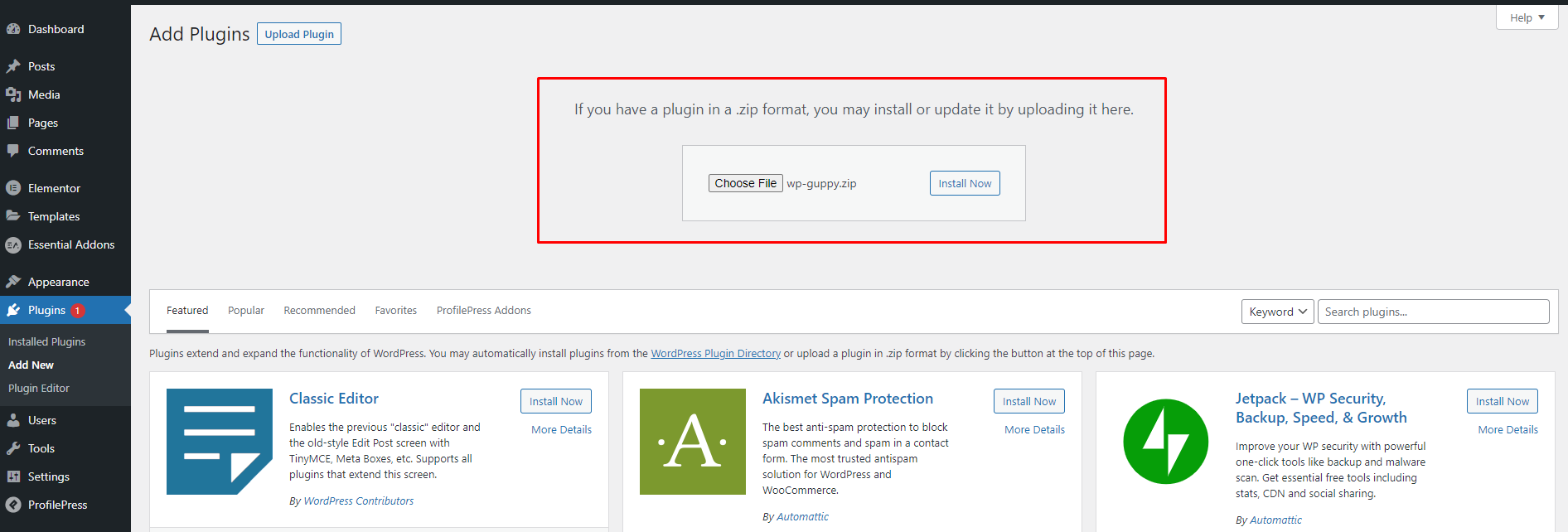 Installing WordpressWhen you are ready to install a plugin, you must first upload the plugin files and then activate the plugin. For this purpose, unzip the file that you downloaded from codecanyon and there you would find the (wp-guppy.zip) file and upload it via WordPress installer. The plugin files can be uploaded in two ways