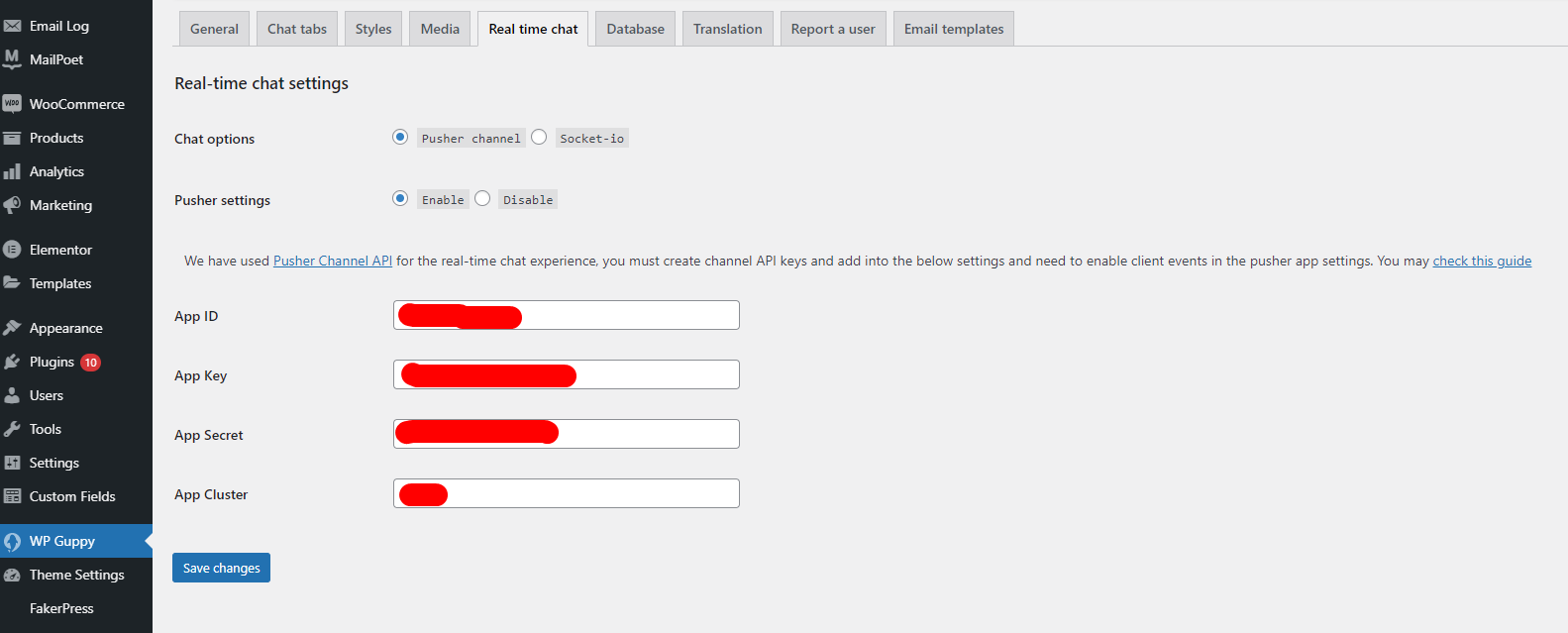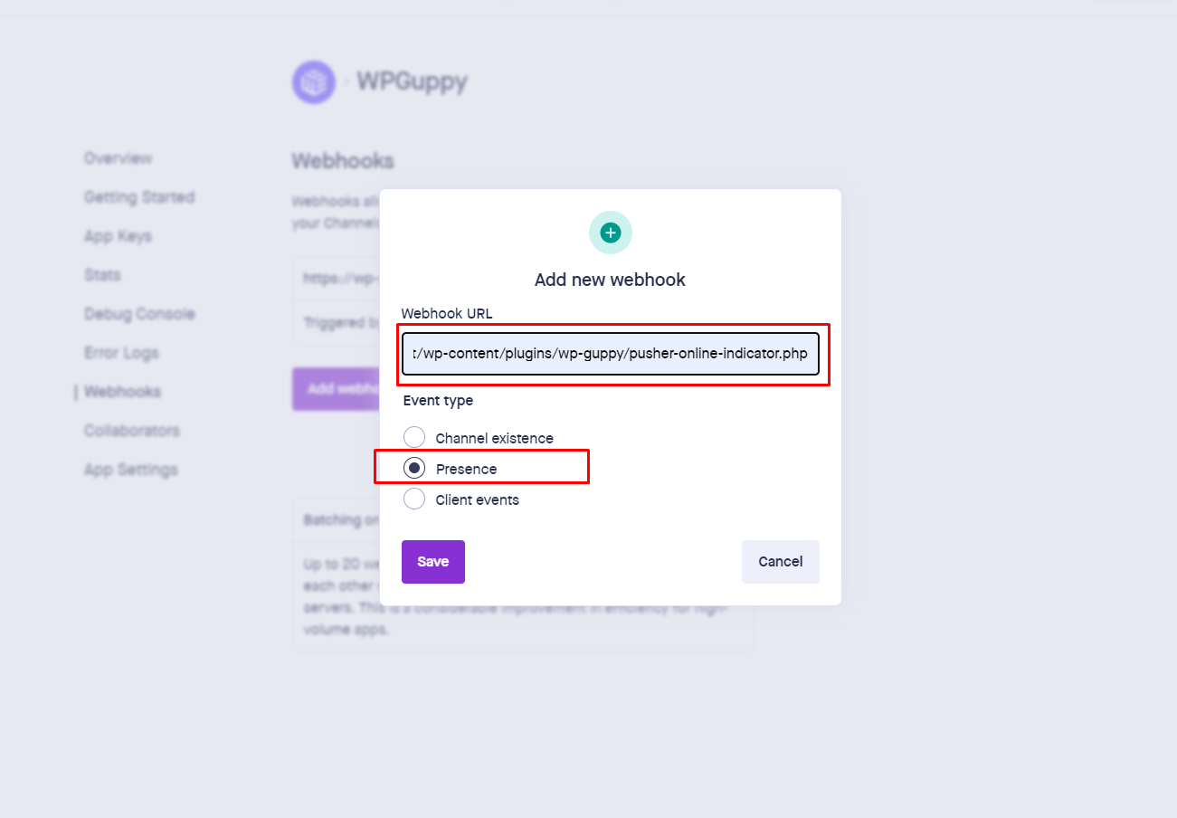 Note, please make sure your URL path should be the same from here onward (wp-content/plugins/wp-guppy/pusher-online-indicator.php)